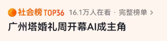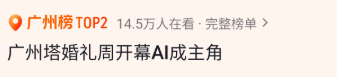在小红书平台,围绕“宠物友好展区”“AI婚庆”“露天秀场”等差异化标签形成深度种草矩阵,相关笔记总量超2000篇,累计曝光突破2500万,“#广州婚礼时尚周”话题下,用户自发分享的逛展攻略、打卡动线、备婚探店等内容形成矩阵式传播,多条高赞笔记详细梳理展会亮点;同时活动在短视频平台凭借话题#广州塔婚礼周开幕AI成主角,登上广州同城热搜TOP2,并成功突围至全国社会榜TOP36,其中“Ai赋能婚庆”“宠物相亲角”“直升机求婚”“广州塔下浪漫婚礼”等名场面视频在平台点击互动急速飙升,实现从垂直婚庆圈层向大众兴趣流量的破圈传播。