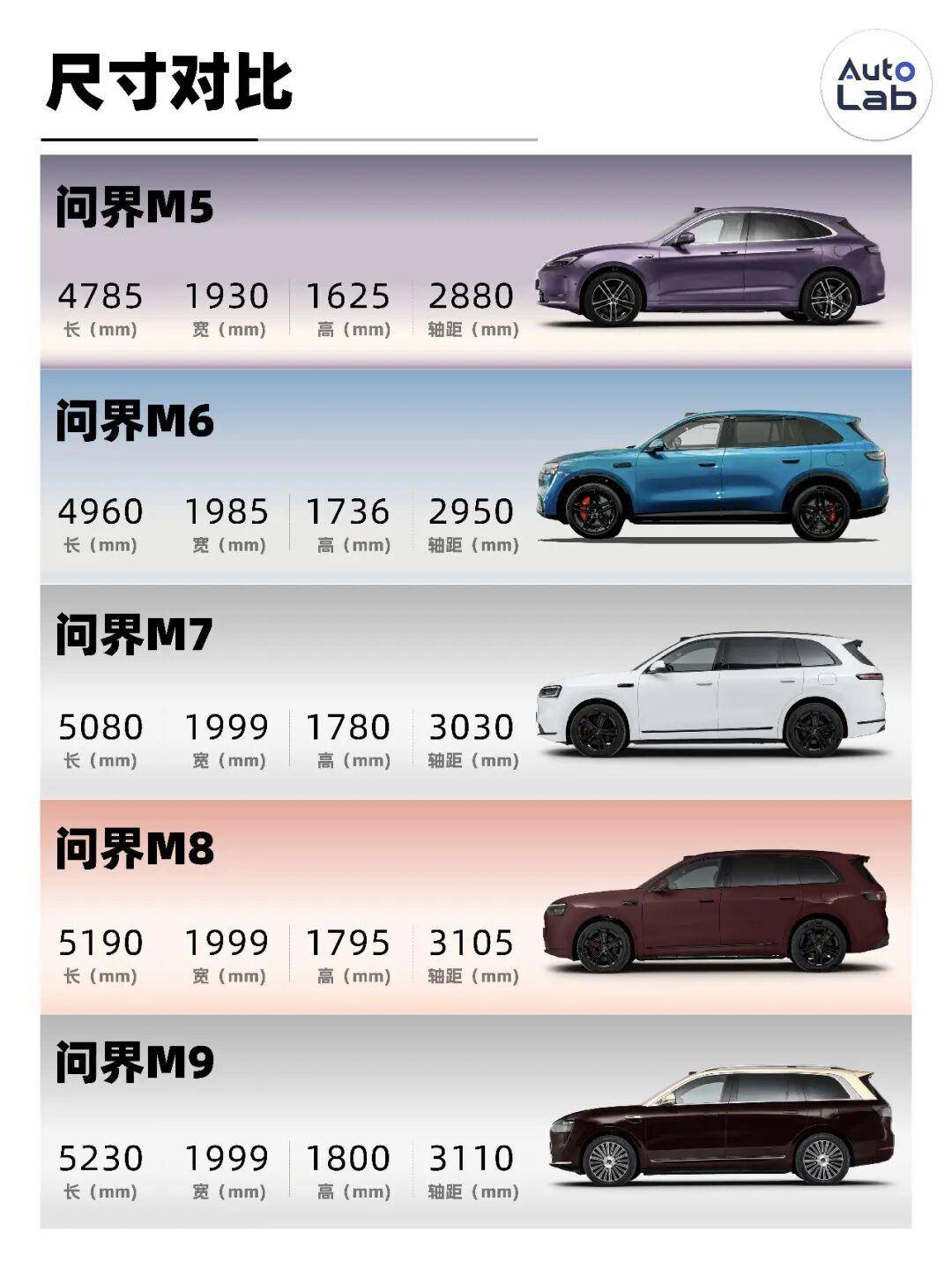 我们把问界家族几台SUV的尺寸放在一起对比了下,不难发现它们之间的划分其实非常清晰,每台车基本都占据着一个比较明确的位置。