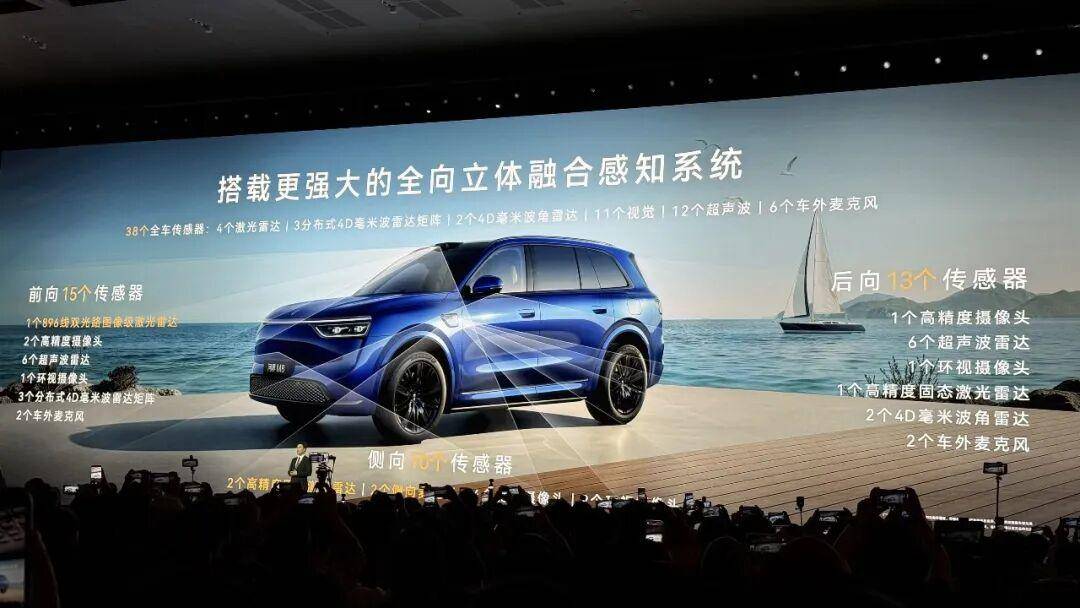 新车同样搭载了一颗896线双光路图像级激光雷达,同时在原有后向固态激光雷达的基础上新增左右两个方向的激光雷达,组成“四激光雷达”的感知方案,整车传感器数量达到38个。
