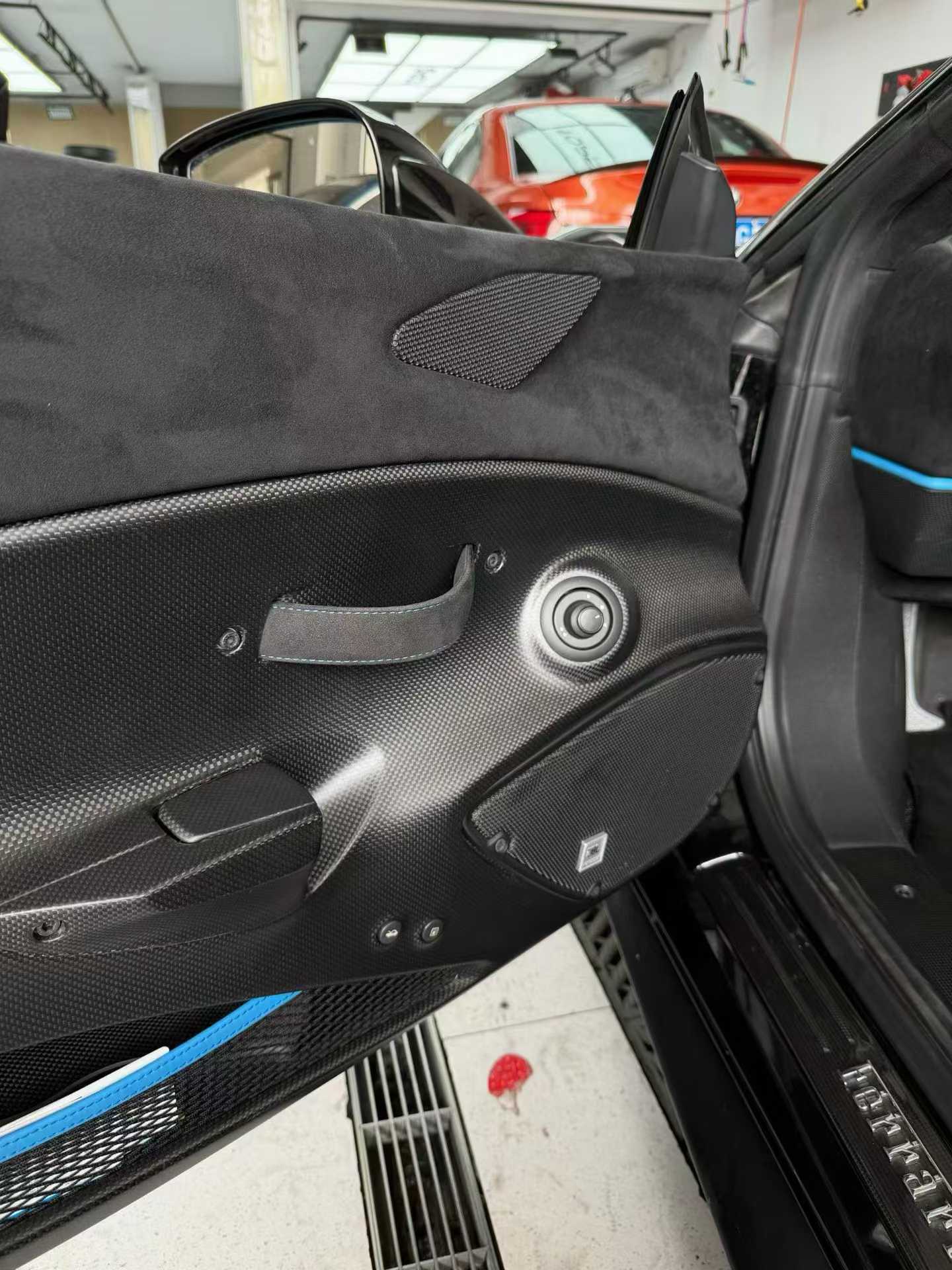 内饰同样是高定思维的延续。没有满眼的Alcantara和碳纤维堆砌出来的战斗感,取而代之的是一种意大利式的、沉静的审美。座椅选用深蓝色皮革与Alcantara拼接,缝线与车身那抹深灰遥相呼应。这不像是一台要随时刷圈速的车,更像是一位深谙驾驶之道的收藏者,为自己挑选的一件贴身器物。启动键依然是那抹标志性的红色,静静躺在Gated换挡机构的旁边,等着被按下。