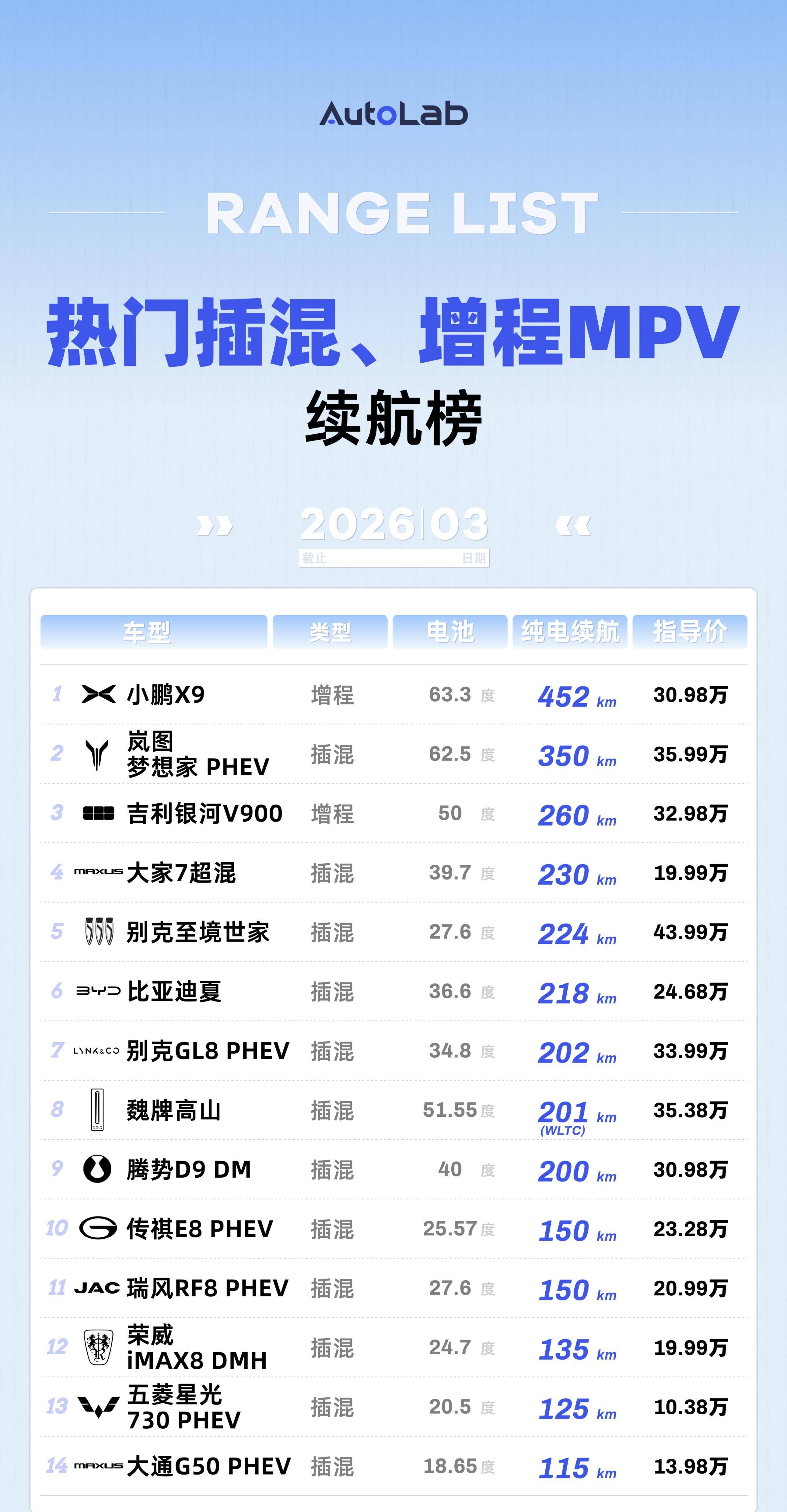 热门插混、增程MPV续航榜