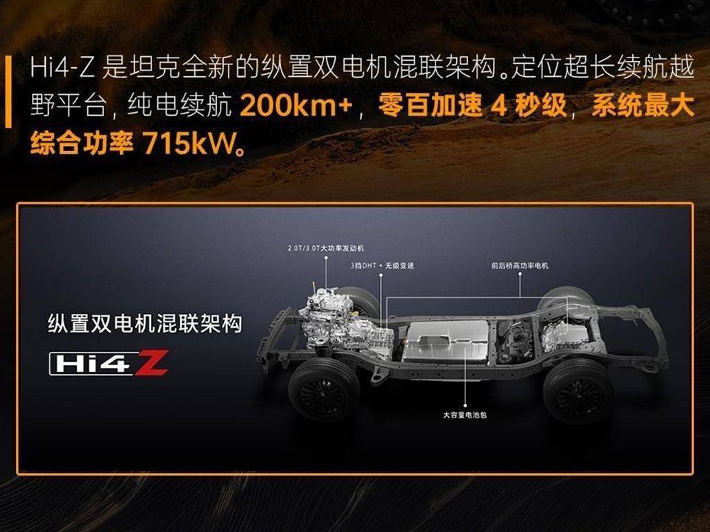 动力方面是新款坦克300的重头戏。新车搭载2.0T发动机+电机组成的插电混动系统,发动机最大功率185kW,匹配镍钴锰三元锂电池组。但更值得关注的是,长城为其提供了Hi4-T和Hi4-Z两种混动方案。