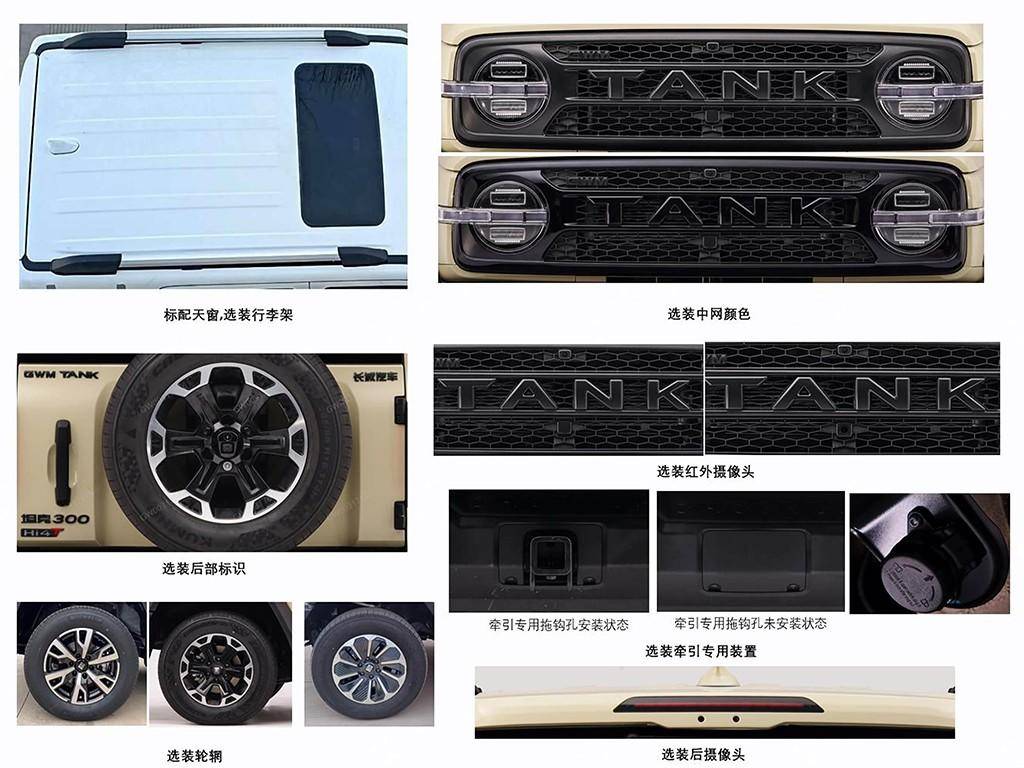 从申报图来看,新款坦克300在保留经典圆形大灯的同时,换装了全新的中网造型,车标也由原先的“坦克”图形标识更换为“TANK”字母标识,视觉上更加简洁大气。前保险杠造型更加粗犷,翼子板处增加了鲨鱼鳃装饰,机舱略有加长,整体姿态更显威猛。