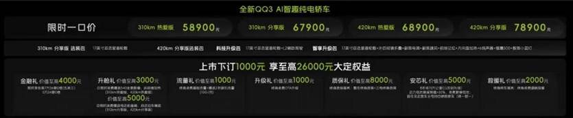 3月30日,“王者归来 一部到位”全新QQ3上市发布会在成都露天音乐公园盛大举行,一代“国民神车”在智电时代越级焕新,推出310km、420km两种续航版本共四款车型,官方上市价5.89万元起。此前车型已取得盲订订单超6万台、预售订单超4万台的傲人战绩。全新QQ3正式上市用“高颜值、大格局、强体魄、更懂你”的四大核心价值,诠释“一部到位”的快乐生活。