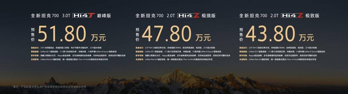 3月30日,在坦克品牌“新时代·新旗舰——人生自此新境”发布会上,全新坦克700(参数|询价)正式开启预售。新车推出3.0T Hi4-T、2.0T Hi4-Z两大动力版本共3款车型,官方预售价43.80万-51.80万元。作为坦克品牌向上的重磅战略车型,全新坦克700定位“全域豪华SUV新旗舰”,以中华传统文化及智慧为根,以长城汽车全栈自研核心技术为底,满足从商务通勤、家庭出行到长途穿越,以及极限越野的全场景需求,开创全域豪华SUV新品类,为全球用户带来全场景无短板的豪华出行新体验。