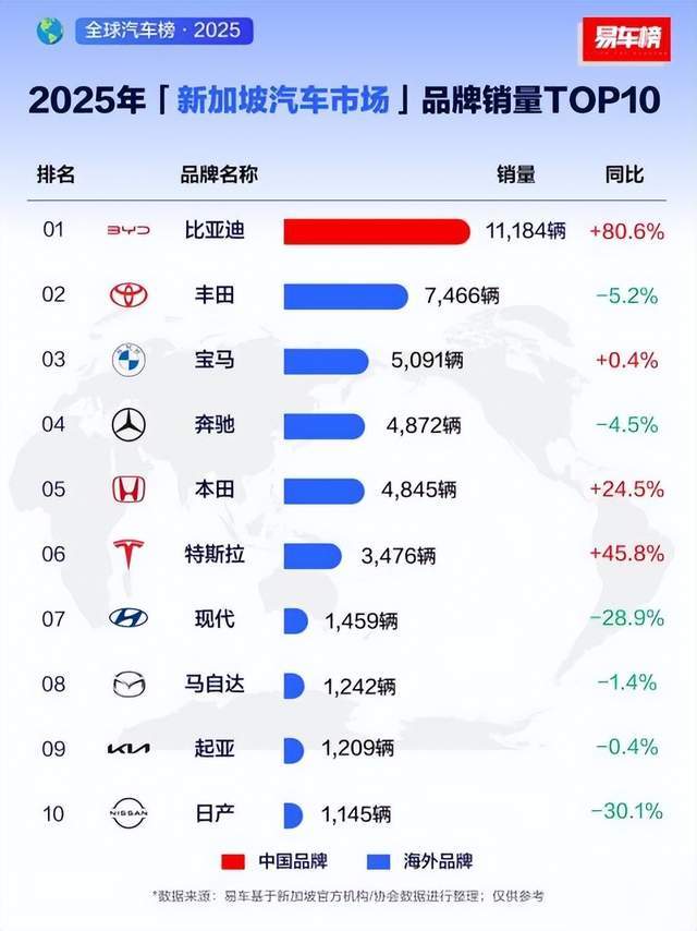 近期,据新加坡陆路交通管理局数据显示,2025年,比亚迪乘用车在新加坡销售11184辆,同比增长80.6%,蝉联年度全品牌销量冠军。自2022年,比亚迪正式进入新加坡乘用车市场,仅用两年时间成功登顶榜首。