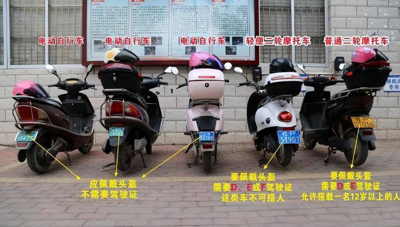 黄牌(电动普通摩托车/三轮车):属机动车,需E证或D证及交强险,二轮可载1名成人,三轮不得载人。