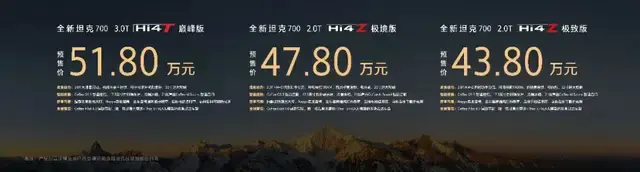 3月30日,坦克品牌全新坦克700正式开启预售,新车定位全域豪华SUV,提供Hi4‑T与Hi4‑Z两种动力版本,共三款车型——全新坦克700 Hi4‑Z极致版预售价43.8万元,Hi4‑Z极境版预售价47.8万元,Hi4‑T巅峰版预售价51.8万元。