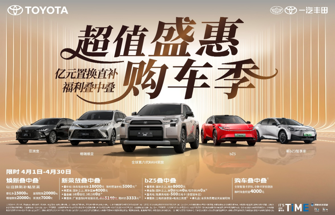 不负春日好时光,一汽丰田超值盛惠购车季同步开启,亿元置换直补福利叠加,诚意满满敬献广大用户。本次一汽丰田亿元置换直补覆盖全明星产品,重磅福利抢先解锁:4月30日(含)前下订新荣放,且在2026年5月31日(含)前完成购车开票的用户,可享18000元现金权益+5000元限时燃油补贴,国补之上再叠加至高4000元置换补贴;也可选择5年0首付、前2年/3年0息的金融补贴(置换、金融二选一);同时还能享受厂家直销6年双保无忧服务补贴(原价5140元,限时价3333元)。