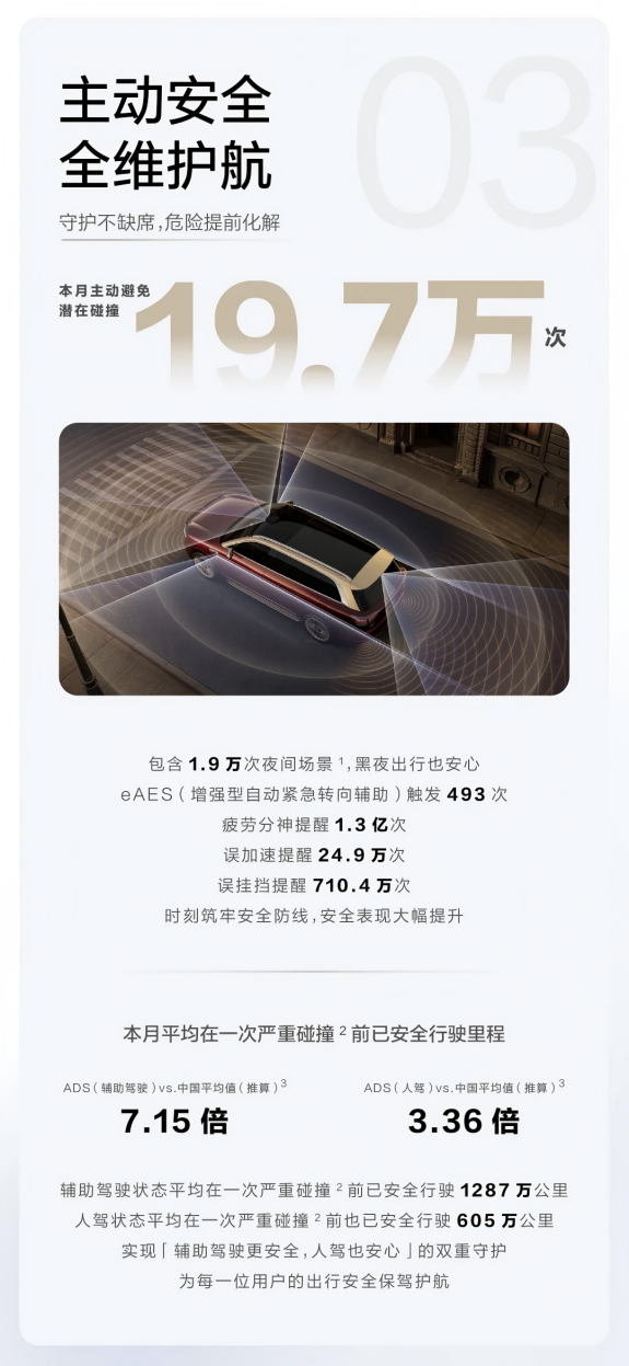 问界始终坚持“安全是最大的豪华”,致力于用科技守护每一次出行。报告显示,问界3月主动避免潜在碰撞19.7万次,其中包含1.9万次夜间场景,黑夜出行也安心;eAES(增强型自动紧急转向辅助)触发493次、疲劳分神提醒1.3亿次、误加速提醒24.9万次、误挂挡提醒710.4万次;ADS人驾平均安全行驶里程是中国平均值的3.36倍,ADS辅助驾驶更是达到7.15倍;人驾状态平均在一次严重碰撞前已安全行驶605万公里,辅助驾驶状态平均在一次严重碰撞前已安全行驶1287万公里,真正实现了“辅助驾驶更安全、人驾也安心”的双重守护,为每一位用户的出行安全保驾护航。