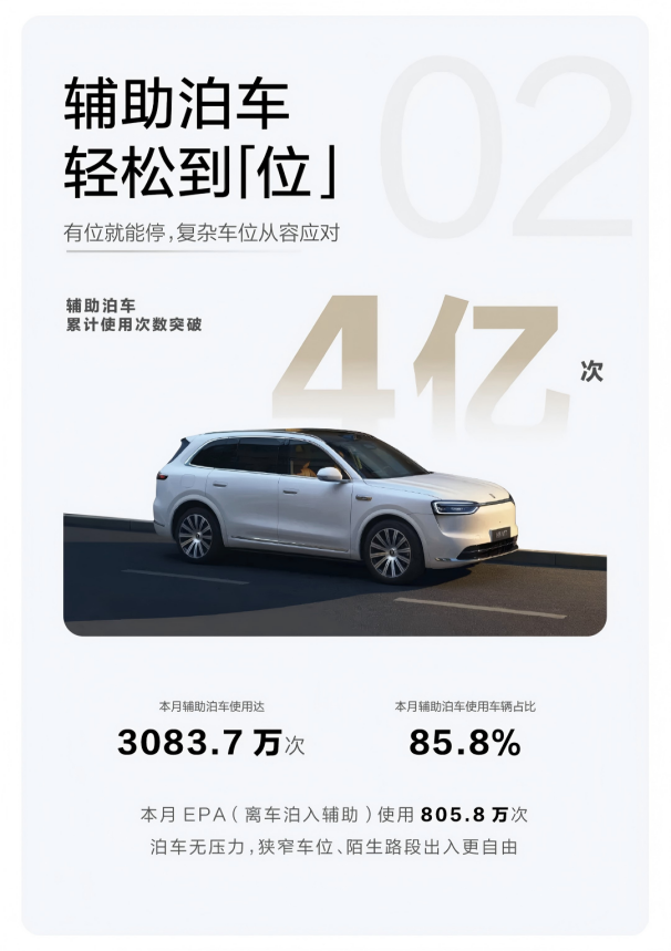 与此同时,问界为用户带来的“有位就能停”的泊车体验,也深受认可和信赖。问界3月辅助泊车使用总次数达3083.7万次,辅助泊车使用车辆占比85.8%,其中EPA(离车泊入辅助)使用805.8万次,目前,问界辅助泊车累计使用次数目前已突破4亿次,真正实现了泊车无压力,狭窄车位、陌生路段出入更自由。