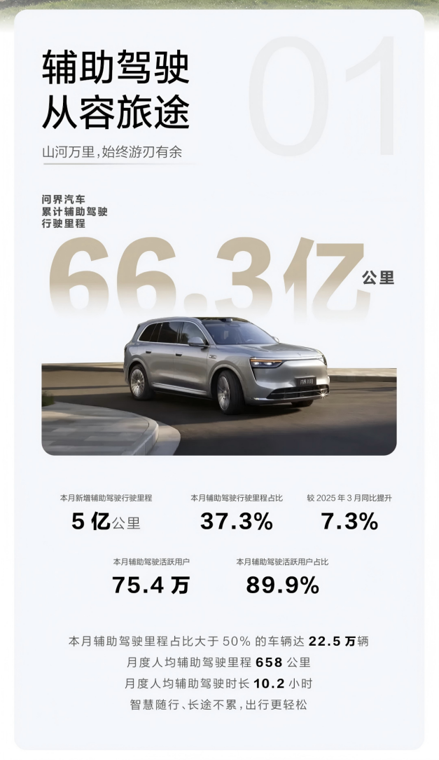 报告显示,问界3月新增辅助驾驶里程5亿公里,辅助驾驶行驶里程占比37.3%,较2025年3月同比提升7.3%,辅助驾驶活跃用户75.4万,辅助驾驶活跃用户占比89.9%,这意味着辅助驾驶已经成为用户日常通勤、长途出行的默认选项。截止目前,问界汽车累计辅助驾驶行驶里程已达66.3亿公里。