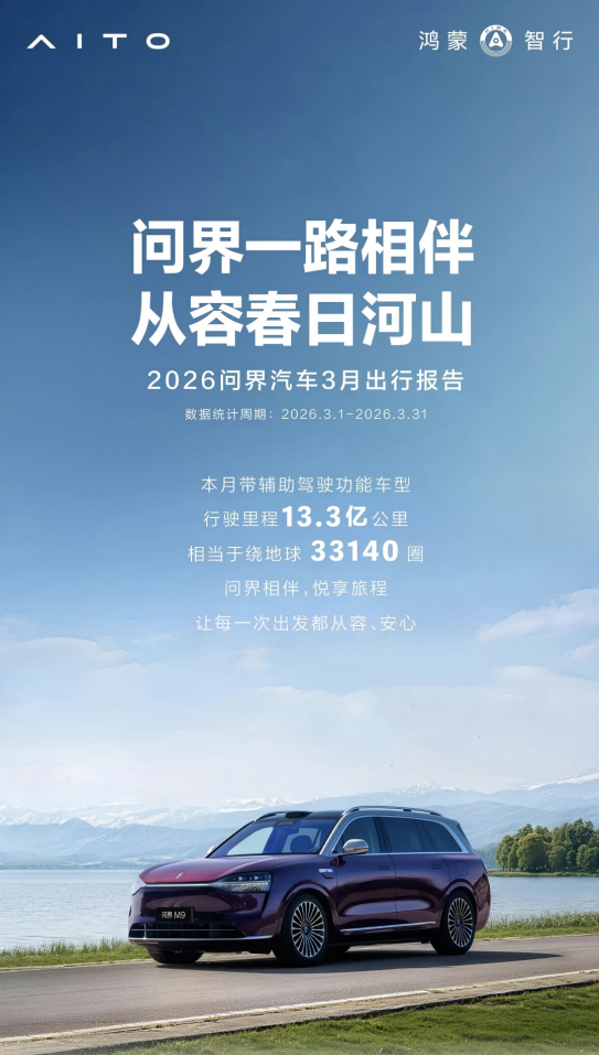 近日,2026问界汽车3月出行报告正式发布。报告显示,3月问界带辅助驾驶功能车型行驶里程13.3亿公里,相当于绕地球33140圈,辅助泊车使用达3083.7万次,与此同时,主动避免潜在碰撞19.7万次。凭借领先的智能科技与豪华品质,问界让用户每一次出行都充满从容与安心。