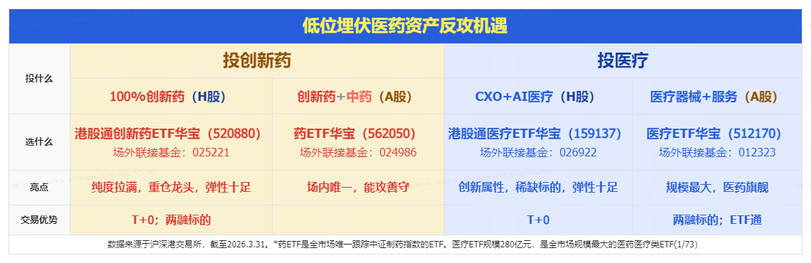 投创新药,认准港股通创新药ETF华宝(520880),100%布局创新药研发类公司,前十大权重股占比超七成,龙头属性突出。希望降低波动,选药ETF华宝(562050),“70%创新药 + 30%中药”的独家配比,兼具创新药高成长及中药高股息。