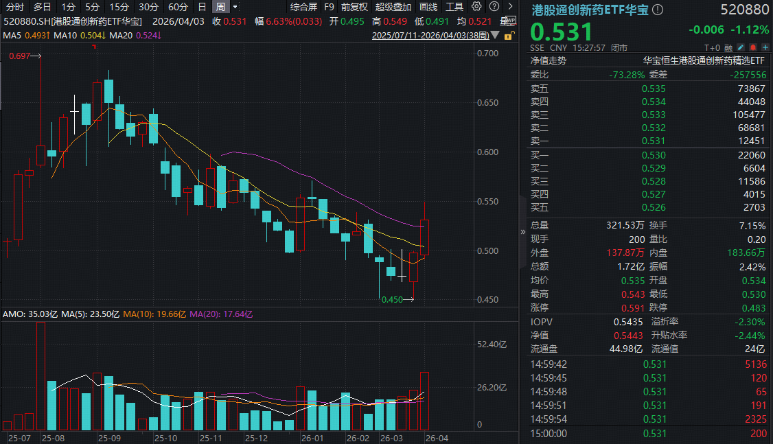 港股因耶稣受难节假期休市,港股通创新药ETF华宝(520880)、港股通医疗ETF华宝(159137)在A股的交易价格完全由资金博弈决定,今日同跌1%左右。