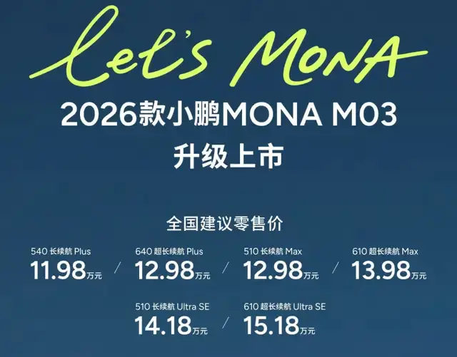 4月2日,2026款小鹏MONA M03(参数|询价)正式上市,共推出6款版型,官方指导售价分别为:540长续航Plus 11.98万元、640超长续航Plus 12.98万元、510长续航Max 12.98万元、610超长续航Max 13.98万元、510长续航Ultra SE 14.18万元及610超长续航Ultra SE 15.18万元。