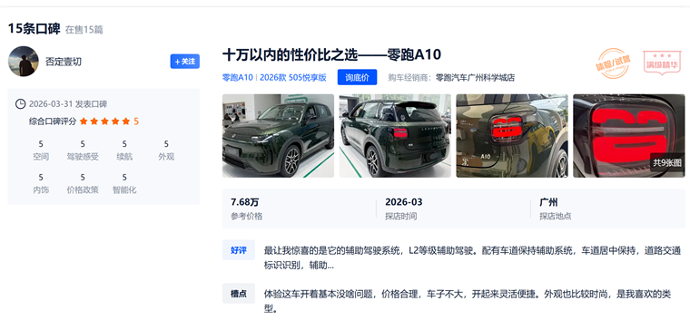 作为刚上市还不到一周的新车,被业内外公认为10万内纯电SUV价值新标杆的零跑A10,不仅在3月最后一个周末创下进店量与试驾量历史新高,还凭借过硬实力收获了近万台的线下门店订单。与之形成鲜明对比,同期的社媒平台也在极短时间内涌现出大量负面的“车主口碑”,并把问题指向全景天幕、车机使用、智驾配置和续航达成率等功能点,那么对于迫不及待要下定零跑A10的准车主们来说,大家该相信哪一方呢?