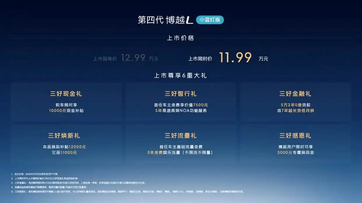 即日起至4月30日,用户购买第四代博越L小蓝灯版可限时享换购补贴12000元,博越用户换购还可叠加3000元专属换购金,此外还有7年超长贷等金融礼、流量礼、智行礼共计6重上市大礼。
