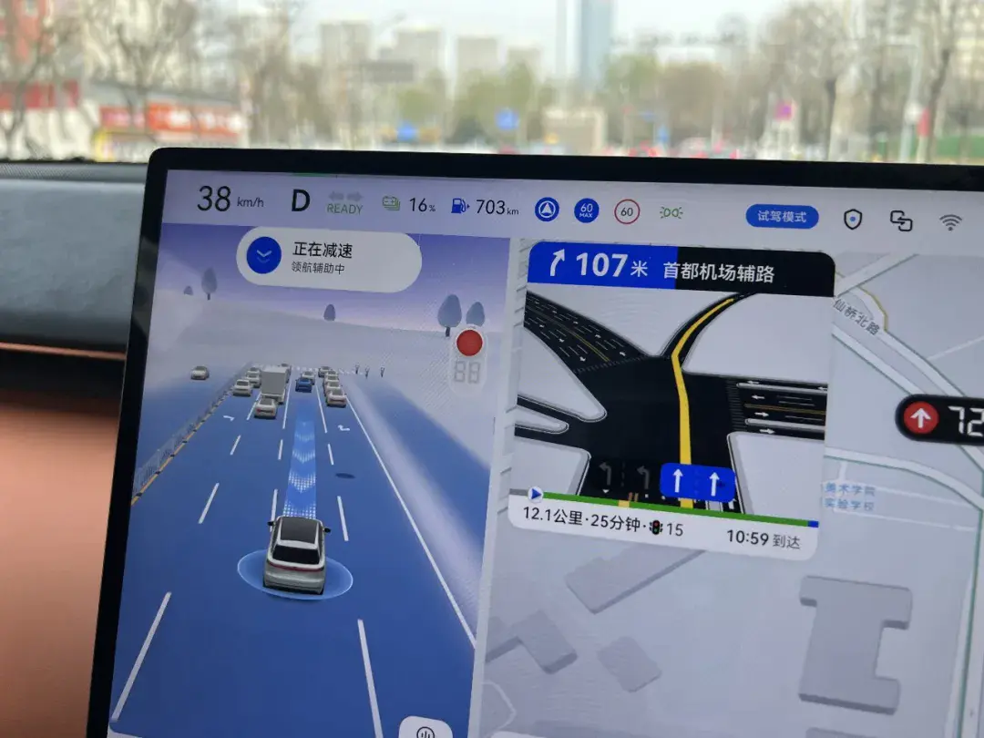在设定好路线后,车辆开启乾崑智驾正式出发走起。说实话,虽然不是第一次体验辅助驾驶系统、也不是第一次体验乾崑智驾系统,但搭载到深蓝汽车上的乾崑智驾系统还是第一次感受,还是有一点点小紧张和小激动的。