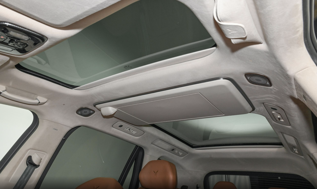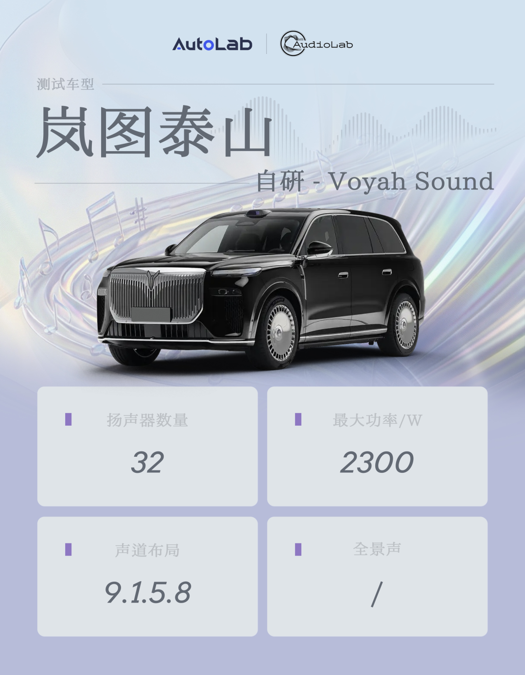 岚图泰山上的音响系统,搭载32个扬声器和9.1.5.8声道布局,包含9 个水平方向的环绕声道、1 个独立重低音扬声器、5 个天空声道扬声器、以及8 个头枕内置扬声器。