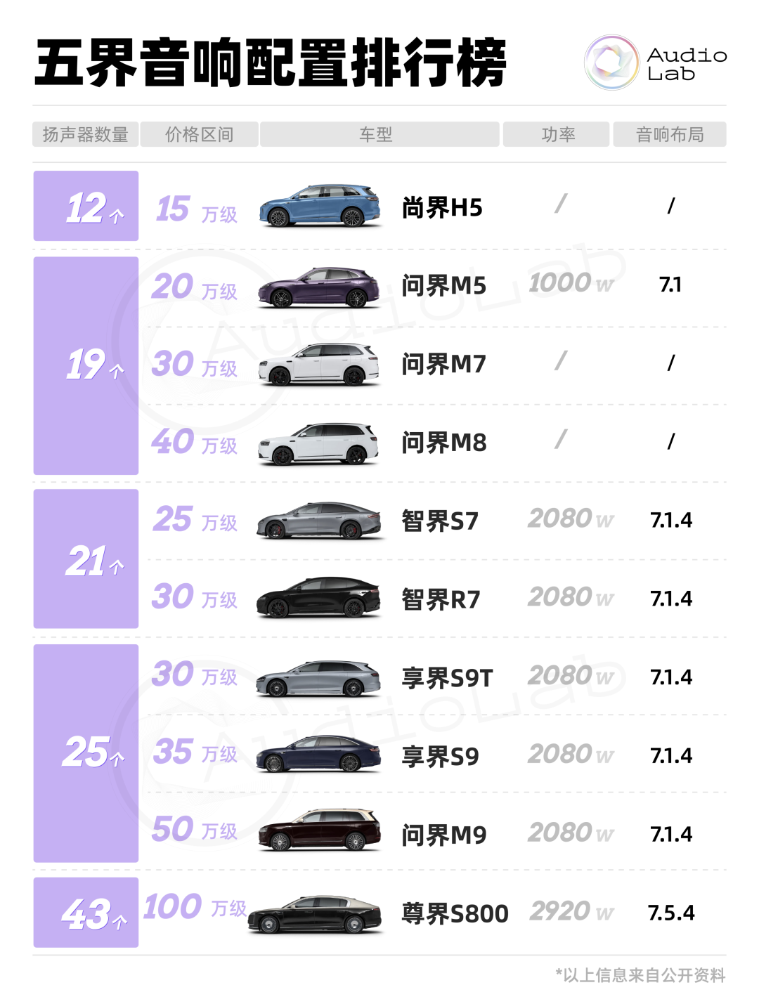 扬声器数量、功率、以及声道布局等规格,基本按照品牌矩阵中不同的价位以及车型定位进行梯度划分。