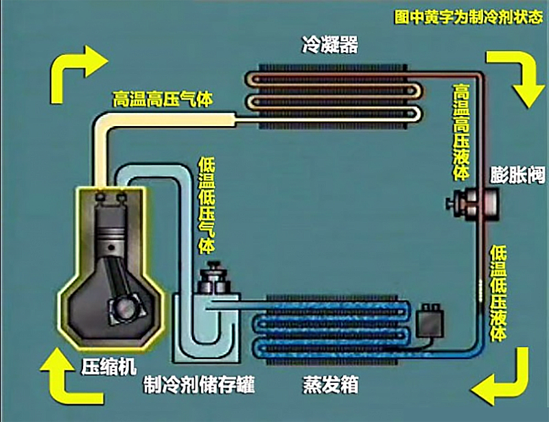 空调制冷的原理是用压缩机驱动制冷剂,制冷剂以R134a四氟乙烷为主,其在零下26.3℃的低温环境中就会沸腾——制冷剂是处于气态状态的,但是压缩机把制冷剂推至冷凝器、干燥罐和膨胀阀之后就会变成液态;可是蒸发器的温度总会高于零下26.3℃,所以四氟乙烷只要达到蒸发器就会再一次且迅速的沸腾。