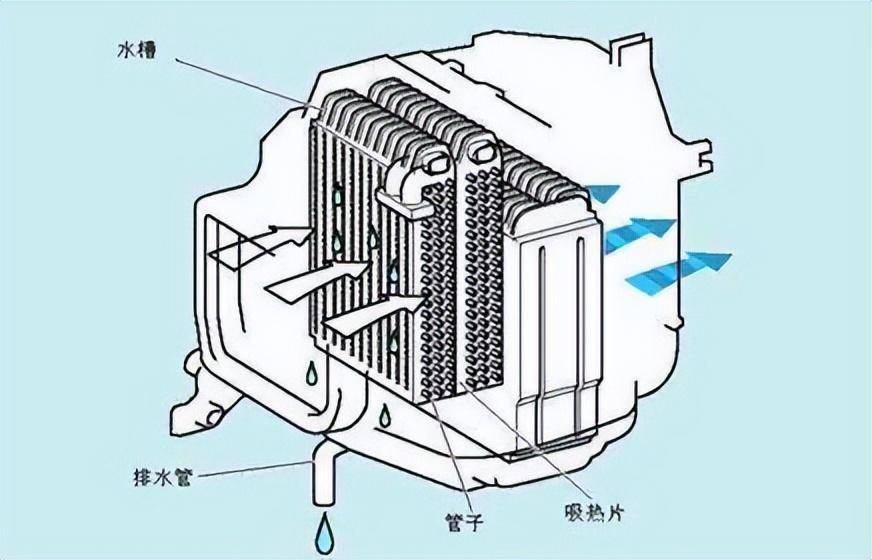 水蒸气预冷凝结是在蒸发箱里完成,水会从蒸发器翅片表面流淌,进而从蒸发箱的排水孔流出。