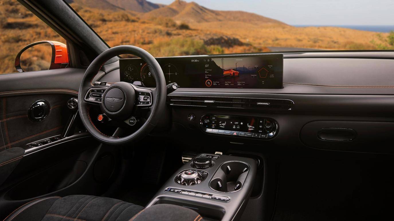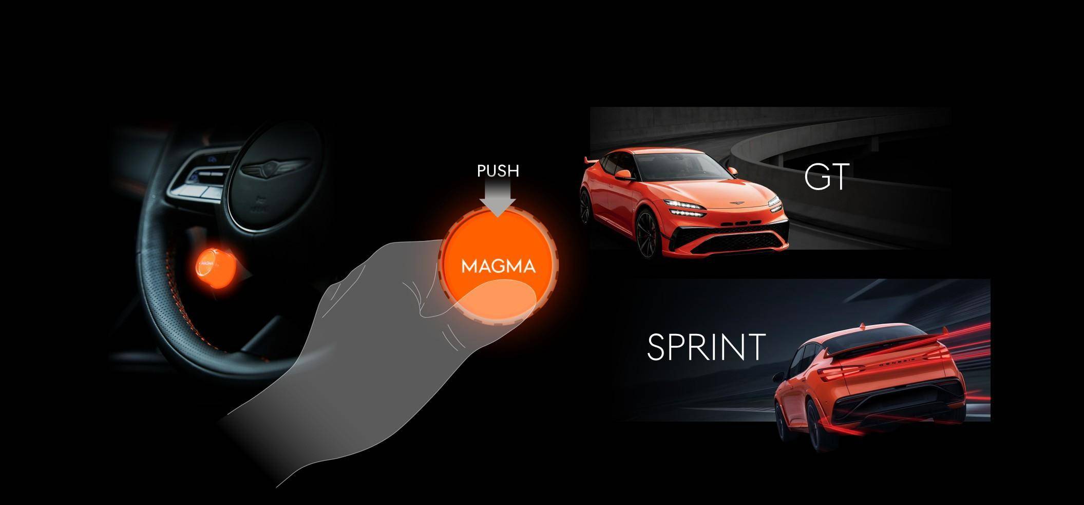 捷尼赛思GV60 Magma方向盘左侧设有专属模式按键,可一键切换Magma独有的GT模式与Sprint冲刺赛模式,让驾驶者根据场景与喜好,即时调整车辆整体风格。