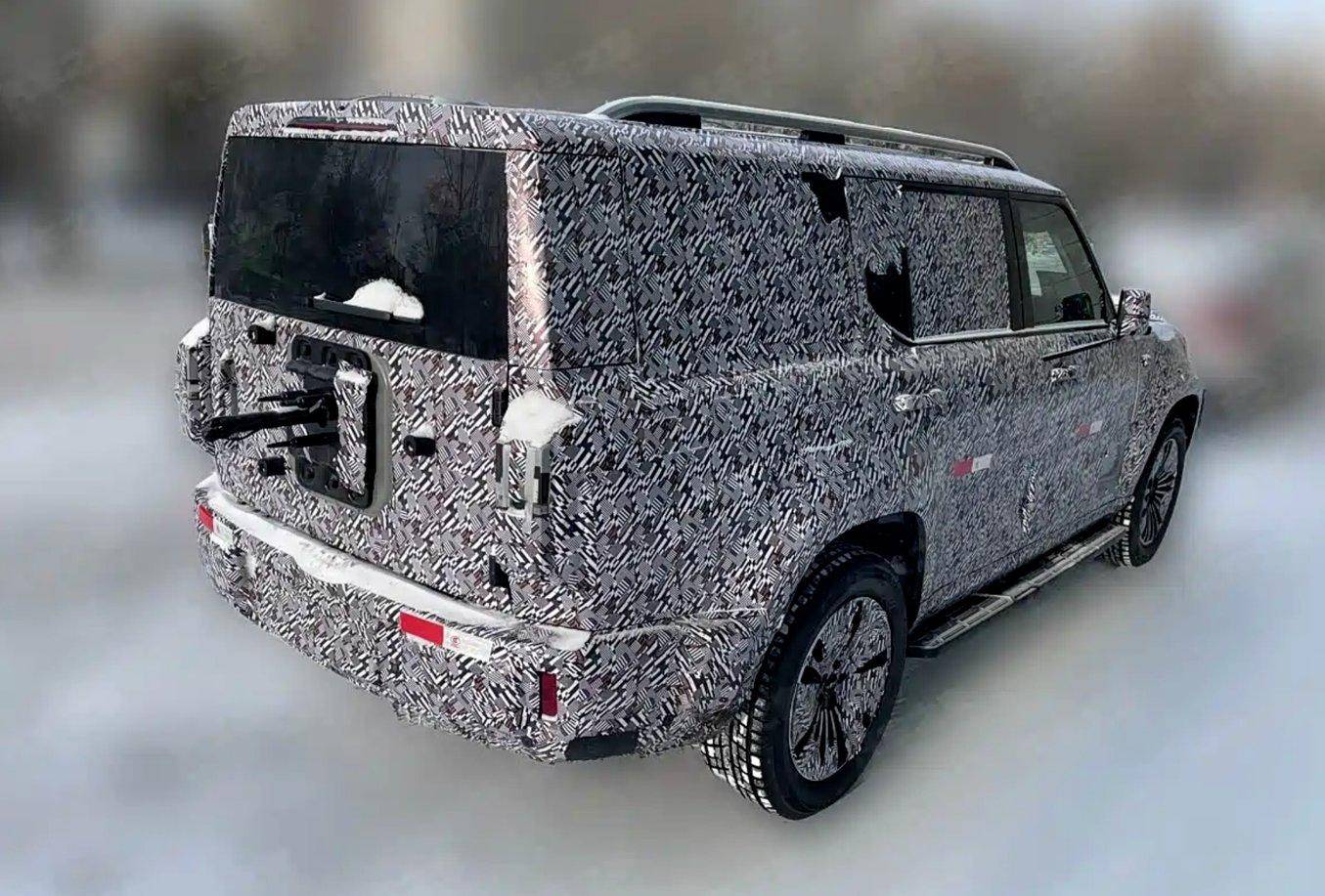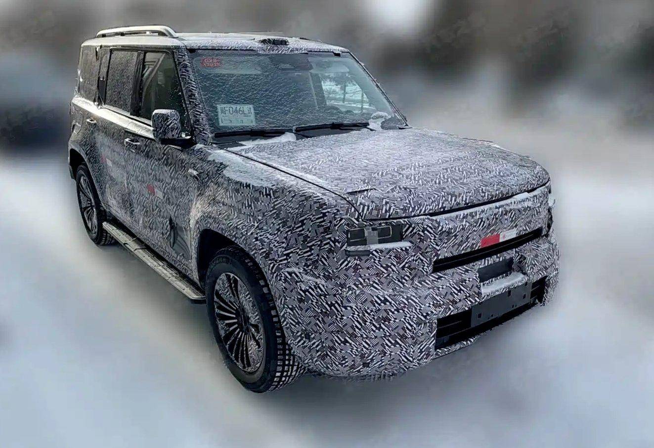 从伪装谍照来看,新车采用硬朗的方盒子车身设计,整体风格极具越野气质。前脸装配矩形大灯组,搭配半封闭式进气格栅,下部包围造型厚重;车顶搭载激光雷达,车身侧翼子板设有感知摄像头,预示其将搭载高阶智能驾驶辅助功能。