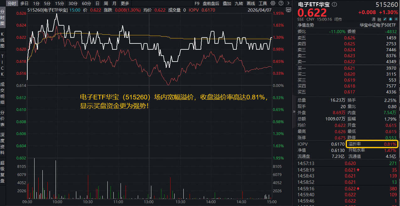 热门ETF方面,双双覆盖苹果产业链+半导体产业链的电子ETF华宝(515260)场内涨幅最高上探1.95%,收涨1.3%,值得关注的是,该ETF场内宽幅溢价,收盘溢价率高达0.81%,显示买盘资金更为强势!