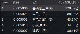 资金面上,基础化工板块获主力资金持续加码。数据显示,截至收盘,基础化工板块单日获主力资金净流入额超过120亿元,净流入额在30个中信一级行业中高居首位。