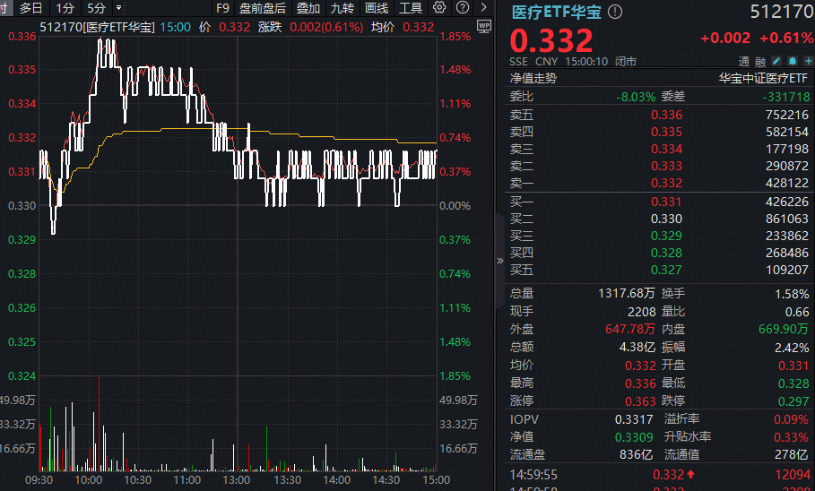 A股医疗板块冲高回落,整体强于大盘。全市场规模最大医疗ETF华宝(512170)早盘一度上探1.85%,全天振幅2.42%,成交4.38亿元。港股休市,A股上市的港股通医疗ETF华宝(159137)提前预热,收涨0.87%。