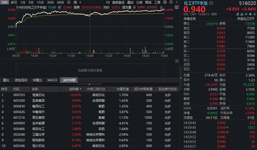 成份股方面,石化、合成树脂、氮肥等板块部分个股涨幅居前。截至收盘,恒逸石化、圣泉集团、鲁西化工三股涨停,华鲁恒升飙涨9.43%,君正集团、宝丰能源、扬农化工等亦涨幅居前。