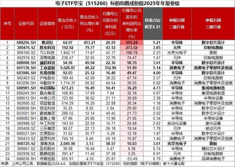 基本面上,电子板块迎来业绩“喜报潮”。截至4月6日,电子ETF华宝(515260)已有24家成份股发布2025年年报,其中,23家上市公司实现盈利,21家归母净利同比两位数增长,寒武纪、胜宏科技、TCL科技归母净利同比大增555.24%、273.52%、188.78%。