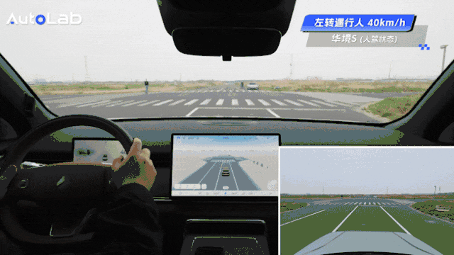 华境S表现为在30km/h和40km/h的速度下都能在转弯全程持续追踪对向横穿行人。目标刚一踏入行驶轨迹,系统瞬时介入制动。