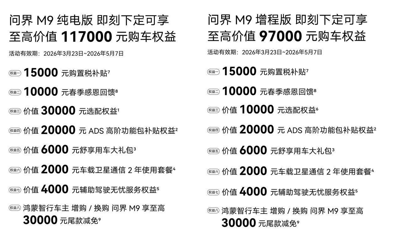 在硬核产品力之外,问界更从用户体验出发,推出一站式上牌服务等暖心举措,让用户告别繁琐的上牌流程,尽享高效、便捷的交付体验,全方位提升用户体验。与此同时,为回馈广大用户的支持与喜爱,问界同步推出限时购车福利,即日起至5月7日下定问界M9纯电版可享至高117000元购车权益,下定问界M9增程版可享至高97000元购车权益,助力更多用户轻松解锁新豪华出行体验。