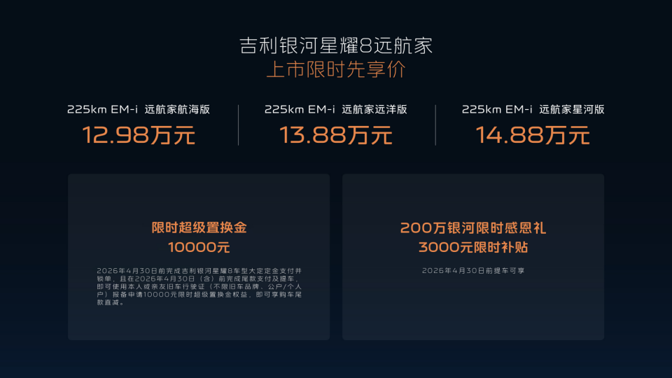 作为品牌布局中高级电混轿车市场的旗舰之作,吉利银河星耀8上市仅8个月勇夺2025年度中国中高级插混轿车销量冠军,并于2026年1-3月连续蝉联月度销量冠军。凭借全面跃升的五大旗舰实力,星耀8远航家将为中高级轿车用户带来更具价值的选择,站在品牌200万销量的新起点上,继续以越级的豪华体验,陪伴更多用户共赴美好生活新程!