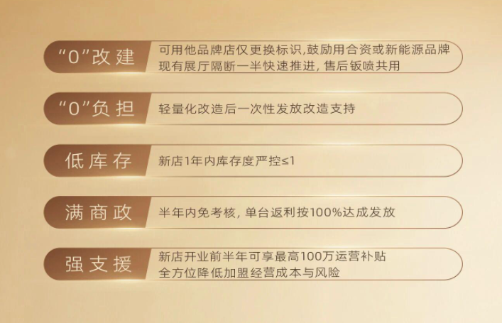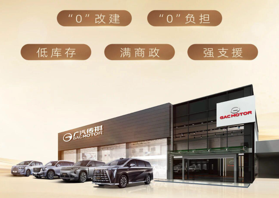 这背后,传祺的招商政策也确实拿出了诚意——“0改建、0负担、低库存、满商政、强支援”。新店可以直接用现有品牌店面更换标识,售后钣喷共用,改造投入降到最低;半年内免考核,单台返利按100%达成发放;前半年最高100万运营补贴……可以说,传祺把经销商的经营风险和成本压到了极致。
