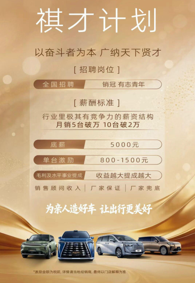 传祺同步启动“祺才计划”,高薪招募全国销冠和有志青年。月销5台收入破万、10台破2万,再加上毛利及水平事业提成……这样的薪资结构,在行业内极具竞争力。人才来了、留住了,服务品质自然水涨船高。