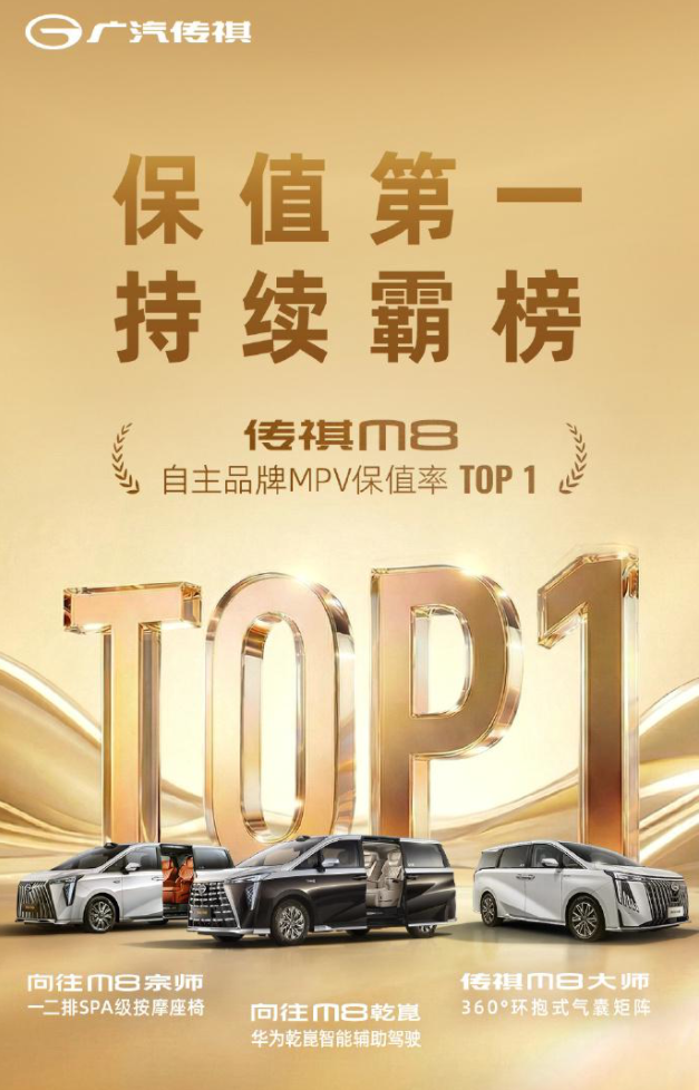 根据《2025年度中国汽车保值率报告》,广汽传祺夺得自主品牌三年保值率第一。其中,GS8、M8、E8分别在自主中型SUV、自主MPV、自主插电混动MPV保值率榜单中登顶,用硬核实力交出亮眼成绩。