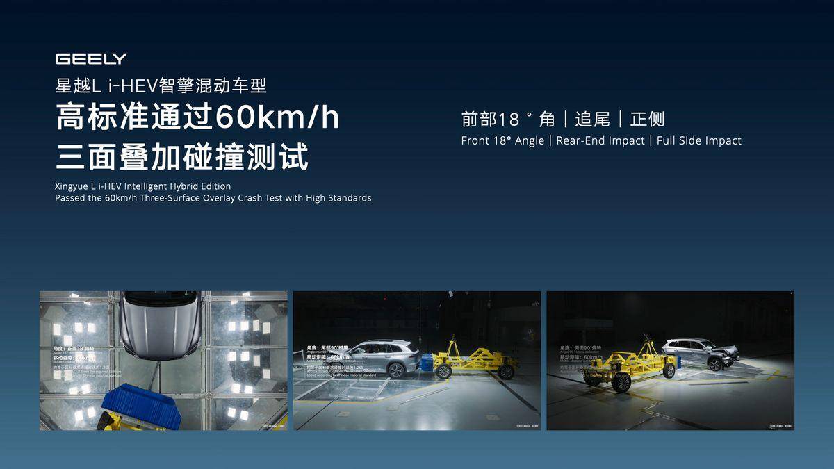 整车安全方面,为充分检验i-HEV智擎混动的安全实力,星越L i-HEV智擎混动经由中国汽研认证,在60km/h的车速下,成功通过全球首个HEV车型前部18°角偏转+后部+正侧三向叠加碰撞测试,以非常规、超标准的极限测试,全面检验i-HEV智擎混动车型的硬核安全实力。