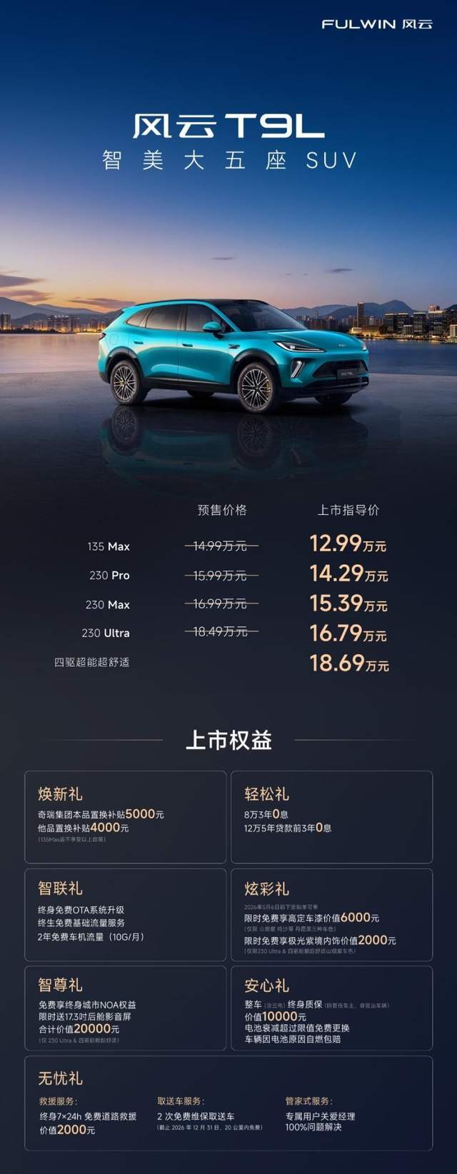 4月13日,定位“智美大五座SUV”的风云T9L正式上市,售价12.99万元起。