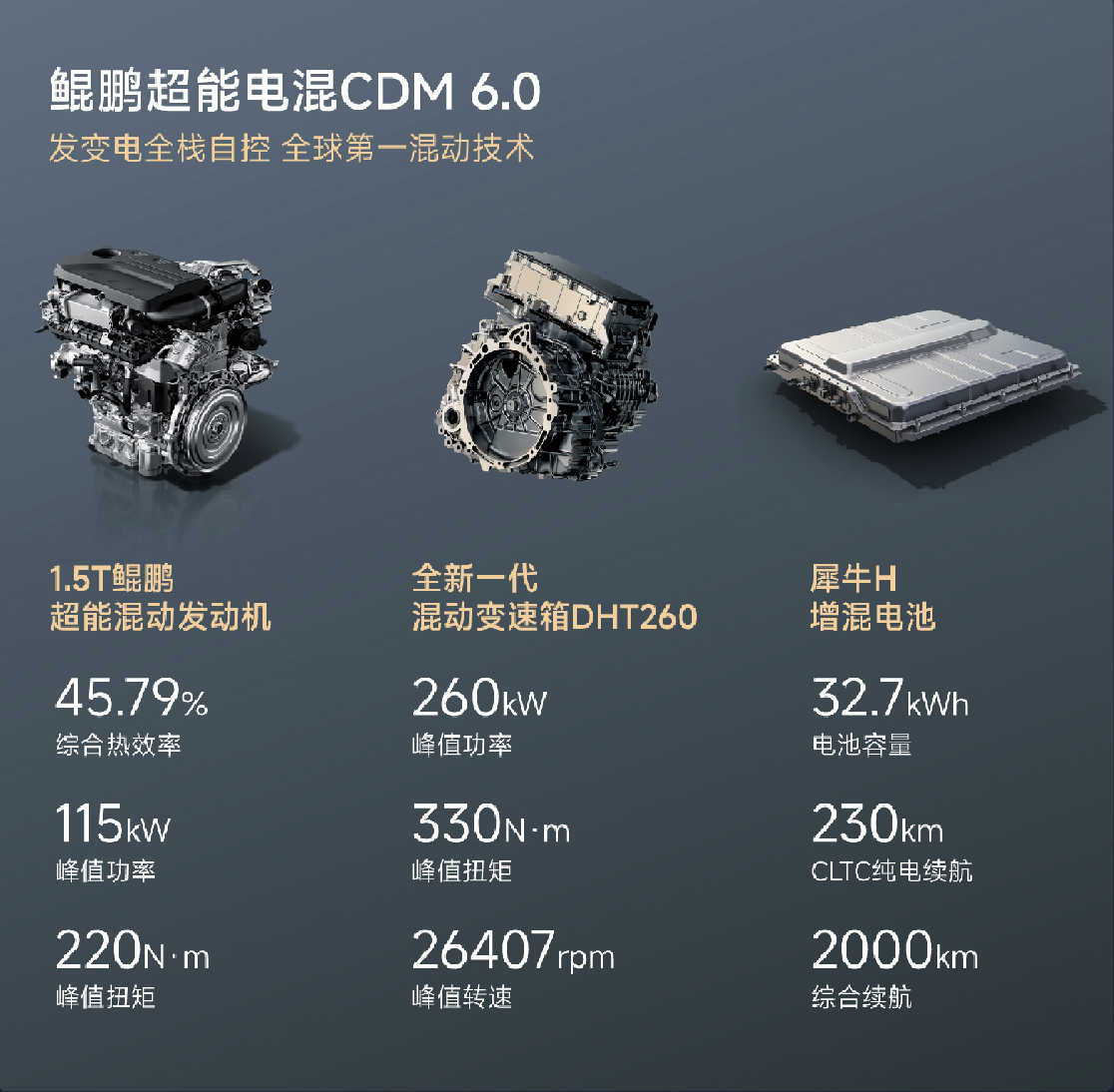动力、油耗和续航,一直以来都是家用SUV的矛盾点所在,总是出现“鱼与熊掌不可兼得”的失衡局面。但风云T9L搭载鲲鹏超能电混CDM 6.0系统无痛解决这一问题,1.5T混动专用发动机可实现45.79%行业领先的热效率,配合DHT260混动变速箱,馈电油耗低至3.9L/100km,市区通勤一公里不到一毛钱,养车成本直接减半。