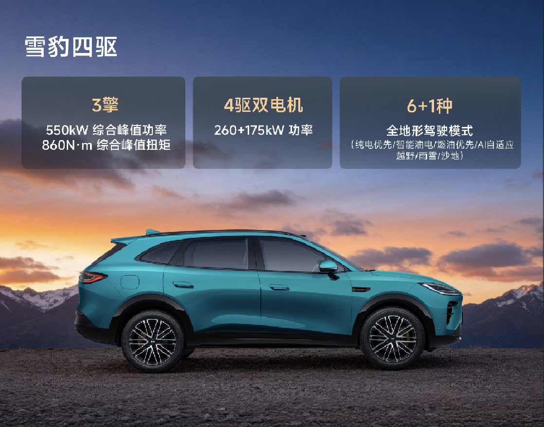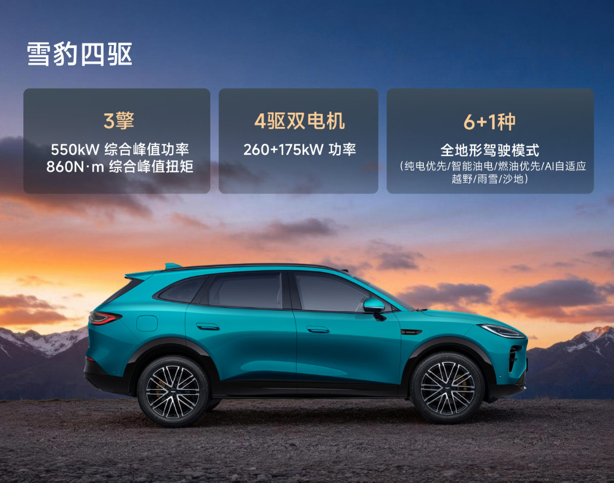而底盘驾控方面也很给力,采用前麦弗逊+后全铝H臂四连杆独立悬架,还有CDC电磁悬挂,软硬自动调节,过减速带、坑洼路面时滤震明显;高速变道、转弯时,车身稳。再加上DP-EPS双小齿轮电动转向、雪豹智能四驱以及6+1种全地形驾驶模式,哪怕是面对沙地、泥地、山地等非铺装路面或雨雪湿滑路面,依旧能保持稳定行驶姿态。