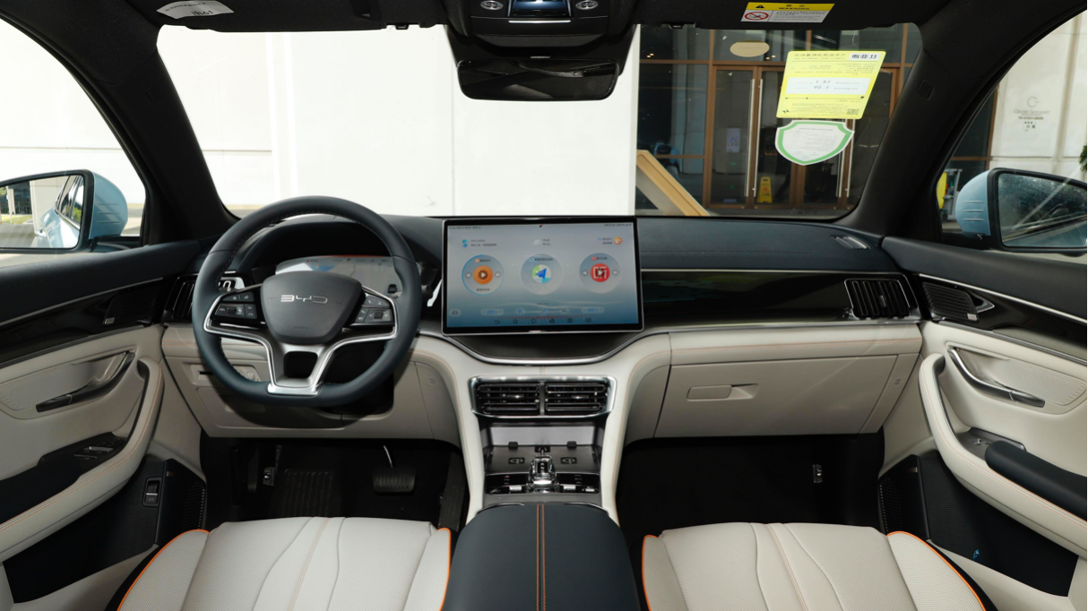 内饰设计上,宋PLUS DM-i冠军版传承了海洋家族的简约美感,造型充斥着海洋的律动感,没有什么花里胡哨的装饰,物理按键的分布均匀,人机交互也挺便捷,观感上也是相当“巴适”。车内使用了12.8英寸的旋转大屏幕+12.3英寸的液晶屏幕的组合,并配备了DiLink车载智能系统,车机的使用还是相当顺滑的。