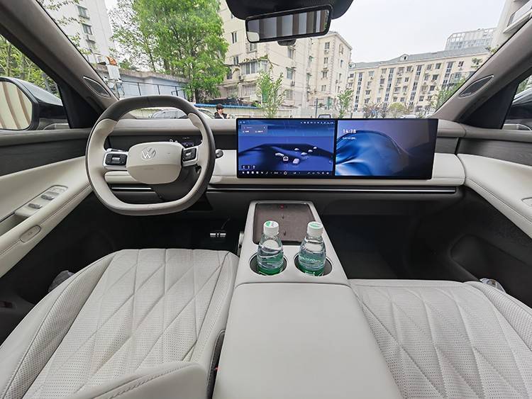 内饰方面,新车车内采用环抱式座舱架构设计,中控台配备双15.6英寸中控屏和副驾屏,并将仪表显示功能融入到中控台的木纹饰板内。
