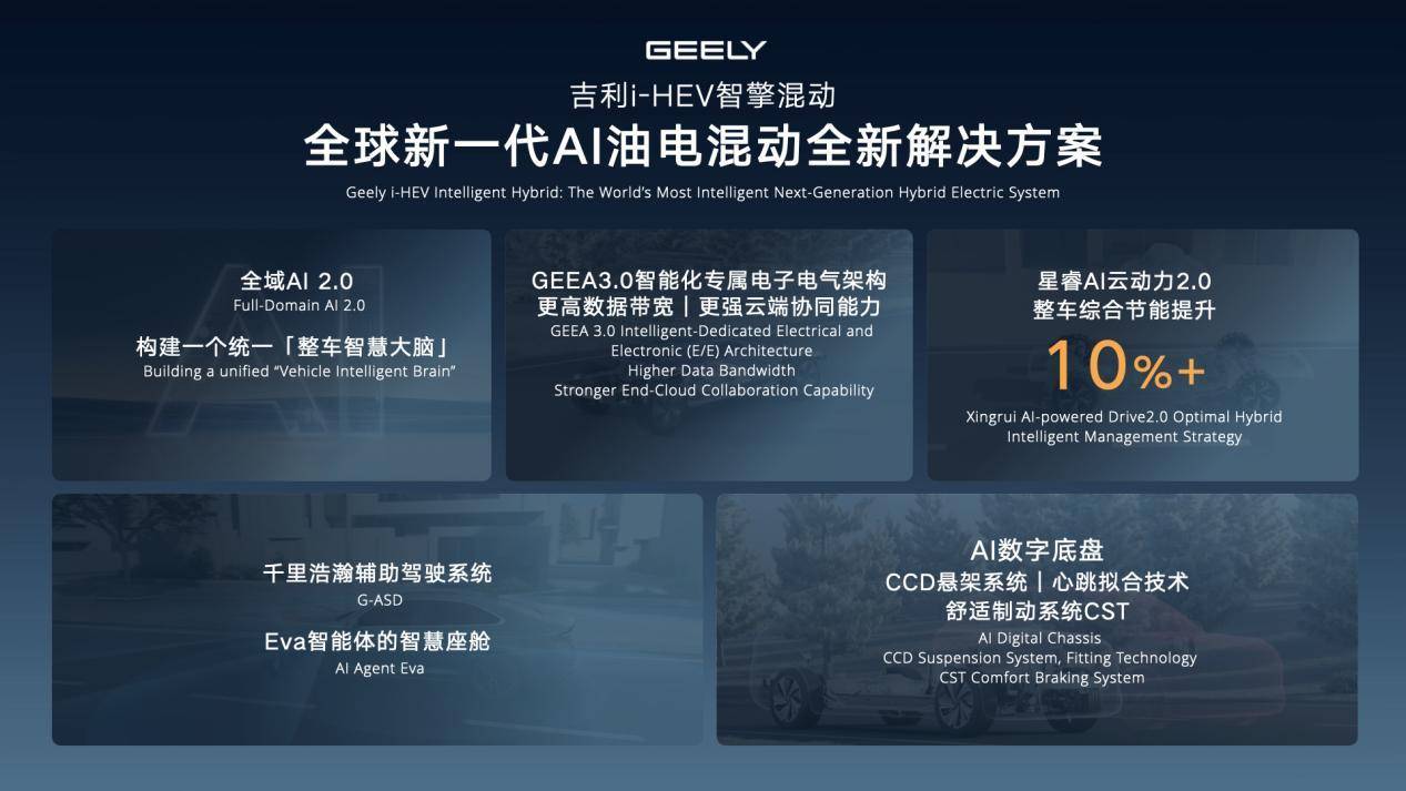 2026年4月13日,吉利汽车集团正式发布全球新一代AI油电混动技术方案——i-HEV智擎混动。该技术依托吉利全域AI 2.0技术赋能,深度融合全球顶尖动力系统与前沿三电技术,以智能、节能、性能、安全、可靠五大颠覆性创新,刷新多项行业纪录,重新定义新一代油电混动技术标准,推动中国混动技术实现全球引领。