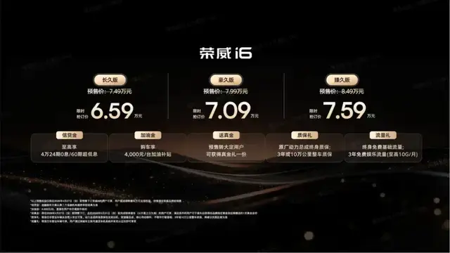 4月13日,上汽荣威推出的新款紧凑级轿车i6开始了预售。荣威i6共有三款车型,分别是长久版、豪久版和臻久版,限时抢订价为6.59万元、7.09万元和7.59万元。目前订车的用户可以享受4万元24期0利息或者60期超低利息的贷款,每辆车4000元的加油补贴和动力总成终身质保的优惠政策。另外,在5月底前锁单提车的用户还将得到足金金钞的额外大礼。