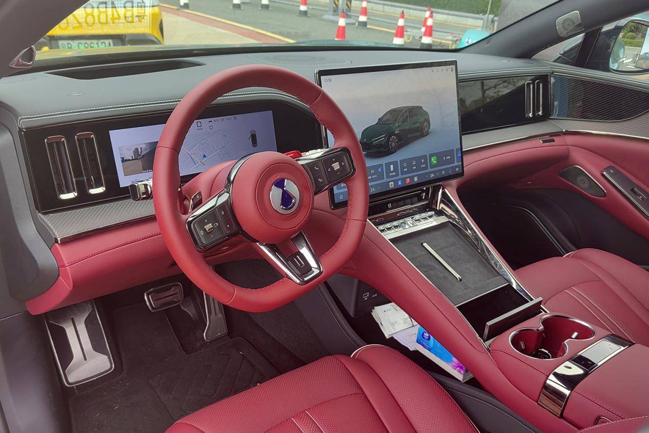 车内采用了亮眼的熔岩红的配色,搭配真碳纤维饰板,整车运动氛围得到了全面升级。中控台采用极简的分层设计,搭载17.3英寸悬浮式2.5k中控屏、13.2英寸液晶仪表和13.2英寸副驾娱乐屏组成的三联屏布局,支持四音区语音识别、5G 网络与整车 OTA;三幅式方向盘上还带有拨片和BOOST按键。