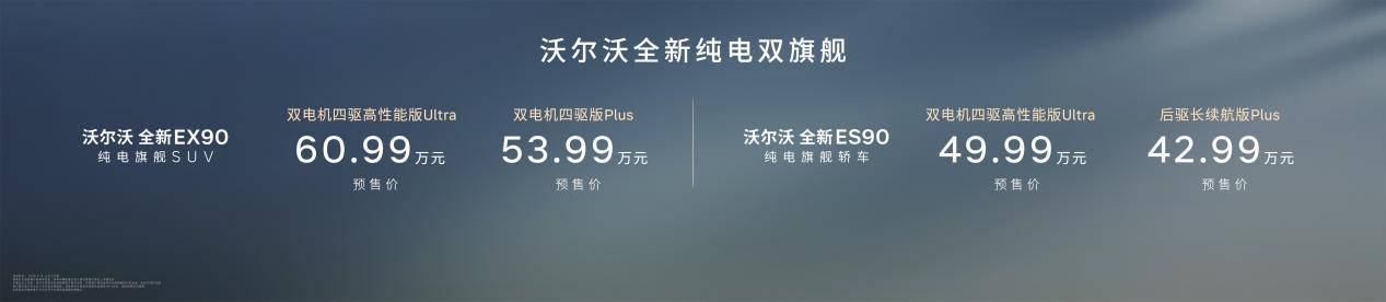 全新纯电旗舰SUV EX90与全新纯电旗舰轿车ES90,不仅传承了沃尔沃的百年安全基因,也是集安全、豪华、驾控三位一体的全能旗舰。基于原生纯电架构SPA2平台打造的两款旗舰车型,遵循全球统一标准、全球统一品质,已在欧洲、美洲、亚洲等多个国家上市,收获全球客户与权威媒体的一致好评。事实证明,纯电时代,沃尔沃依然是出行安全领域的引领者。从燃油时代到电气化时代,沃尔沃汽车用“旗舰之上,再造旗舰”的坚定答案,开启下一个豪华百年新篇章。